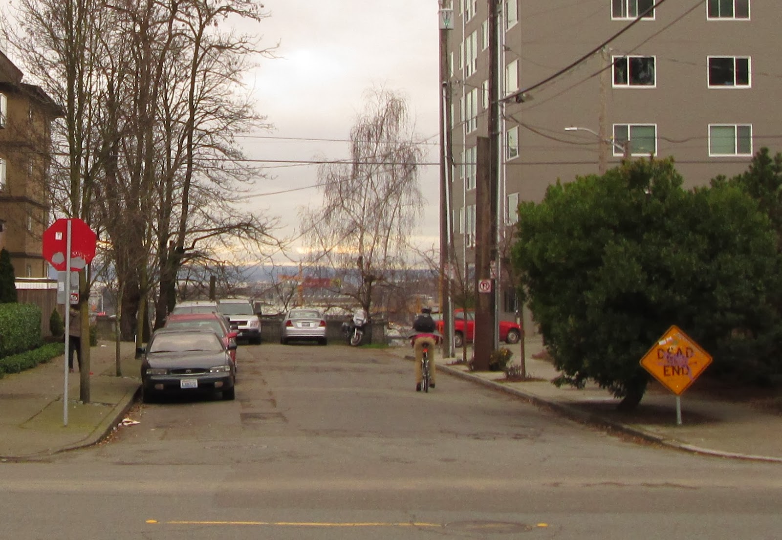 I love streets like this. I once thought about creating a map of exactly these kind of streets. I was going to call it "Street Ends" because that is the other sign you so often see. Fortunately (because I'm lazy) a lot of my work is unnecessary now. The website called Seattle Stairs (http://seattlestairs.home.comcast.net/~seattlestairs/) has a great map of all stairways in Seattle. There is a very strong correlation between stairs like this and dead ends that are just fine for pedestrians. Google Maps by itself does a pretty good job of showing streets like this, which they display as a thin line (instead of a thick one, which is a regular road).